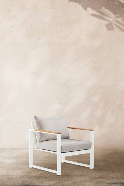 Fåtölj med armstöd av teak och stomme av pulverlackerad aluminium. Du sitter skönt på mjukstoppade dynor och bekvämt ryggstöd. Aluminium är ett praktiskt material som har låg vikt och det rostar inte. Du kan låta det stå utomhus. Viss montering krävs. Produkten består av teakträ som är avverkat från ett hållbart och ansvarsfullt skogsbruk vilket tar hänsyn till både människor och miljö. Kontakta gärna vår kundtjänst om du har frågor kring hur vi arbetar med hållbar teak. Material: Aluminium, teak och polyester. Storlek: Höjd 80 cm, bredd 78,5 cm, djup 88 cm. Skötselråd: Torkas av med lätt fuktad trasa. Du kan välja att ha din teakmöbel behandlad eller obehandlad. Obehandlad teak blir silvergrå. Den bör tvättas med jämna mellanrum med grönsåpa och vatten för att undvika mögelangrepp. Väljer du att behandla teakmöbeln med teakolja får den en mer gyllenbrun färg, behandlingen bör upprepas ungefär en till två gånger om året. Tänk på att förvara din utedyna på en torr plats, väl skyddad från fukt och regn när den inte används. Tips/råd: PAROS är en möbelserie som också innehåller soffa och bord. Tillsammans blir det en trivsam grupp med skön loungekänsla.
