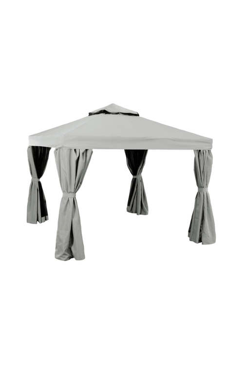 Paviljong Luxor i mörkbrun metallstomme samt tak och väggar i mörkbeige polyester, tyg vikt 300 gram. Paviljongen säljs som ett solskydd och levereras komplett med tak, sidoväggar och myggnät. Medföljer gör även metallstag för att förankra paviljongen i gräsmattan. Levereras omonterad.