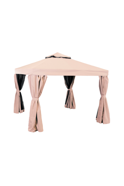 Paviljong Luxor i mörkbrun metallstomme samt tak och väggar i mörkbeige polyester, tyg vikt 300 gram. Paviljongen säljs som ett solskydd och levereras komplett med tak, sidoväggar och myggnät. Medföljer gör även metallstag för att förankra paviljongen i gräsmattan. Levereras omonterad.