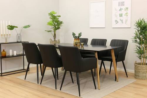Matgrupp med ett Penally Matbord (180) i samt sex stycken Catrin Matstolar. Mått: 90L, 180W, 75B Mått: 63L, 56W, 90B