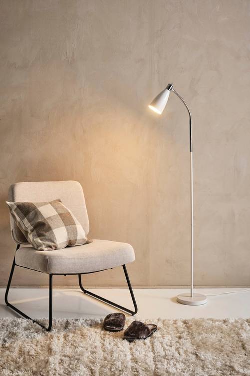 Golvlampa med böjbar arm och med strömbrytare på skärmen. Transparent sladd 170 cm. Material: Metall. Storlek: Höjd 140 cm, bredd 20 cm, djup 40 cm. Sockel/lampa: 1 st E14, max 25 w. Obs! Glödlampa medföljer ej.