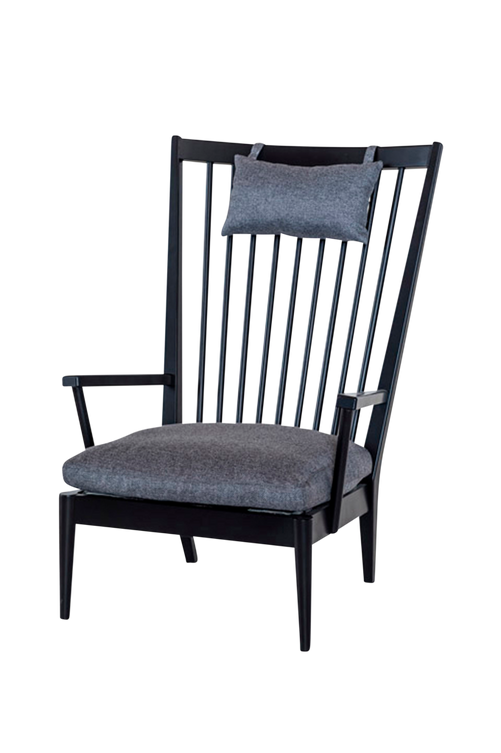 Fåtölj i vitpigmenterad björk, klarlack, med pinnar i ryggen. Dynset med sittkudde och nackkudde i tyg Santana ljusgrå. Bredd 72 cm. Djup 83 cm. Höjd 105 cm. Sitthöjd 39 cm. Vikt 19,5 kg.