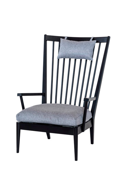 Fåtölj i vitpigmenterad björk, klarlack, med pinnar i ryggen. Dynset med sittkudde och nackkudde i tyg Santana ljusgrå. Bredd 72 cm. Djup 83 cm. Höjd 105 cm. Sitthöjd 39 cm. Vikt 19,5 kg.