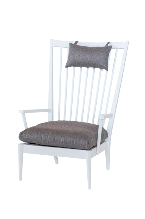 Fåtölj i vitpigmenterad björk, klarlack, med pinnar i ryggen. Dynset med sittkudde och nackkudde i tyg Santana ljusgrå. Bredd 72 cm. Djup 83 cm. Höjd 105 cm. Sitthöjd 39 cm. Vikt 19,5 kg.