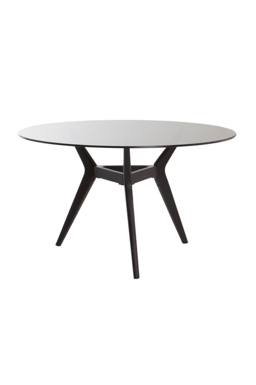 Runt, stilrent matbord med ben av acaciaträ som står i kontrast till den rökfärgade bordsskivan av glas. Att samlas vid ett runt matbord ger samhörighet och gemenskap. Material: Trä och glas. Storlek: Höjd 76 cm, bordsskiva ø 130 cm. Skötselråd: Torkas av med lätt fuktad trasa. Formgivare: Jotex Design Studio.