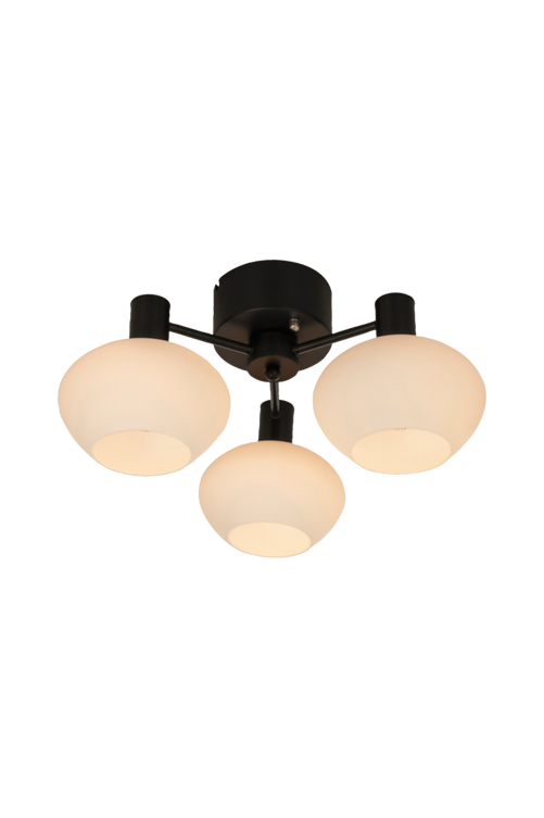 Bell plafond med 3 glaskupor. Lampans huvudmaterial är metall och glas. Max effekt 30W per. ljuskälla. Ljuskälla ingår ej. Lampan monteras i taket på en krok.