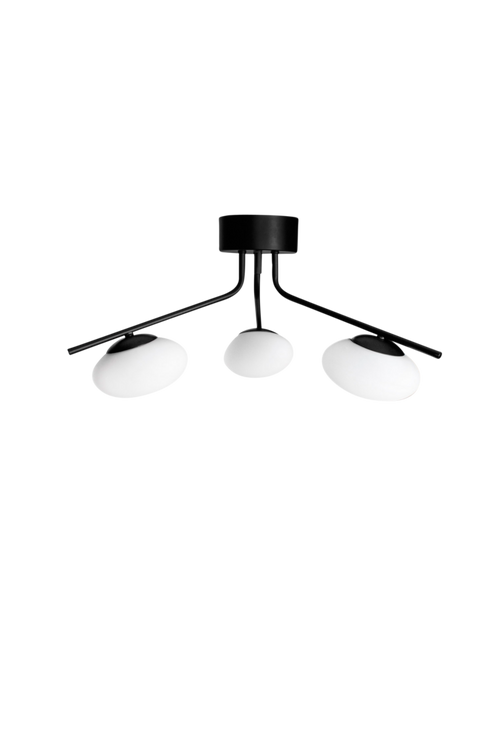 Impera plafond passar dig som vill ha en något nättare lampa i taket, förslagsvis i en hall eller ett rum med lågt i tak – eller där du helt enkelt inte vill ha en hängande taklampa. Plafonden är i en stilig svartmatt metall och har tre armar som håller varsin oval vitmatt glaskupa. Glaskuporna skruvas på separat så du kan välja själv vilket håll du sätter dem åt. Varje glaskupa håller en ljuskälla, vilka köps till separat. Du behöver således 3 ljuskällor med sockel G9. Imperia plafond når ned totalt 28 cm från taket och diametern mellan två armar är 60 cm.