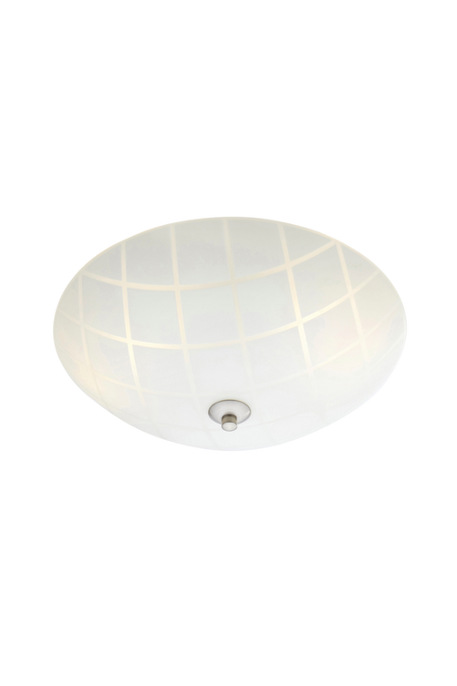 Ruta plafond från Markslöjd. Plafond i vitt glas med rutmönster. 35 cm i diameter och höjd 9 cm. Hängs upp i takkrok. Max 2x40W. E14-sockel. Ljuskälla ingår ej. Dimbar. Ojordad