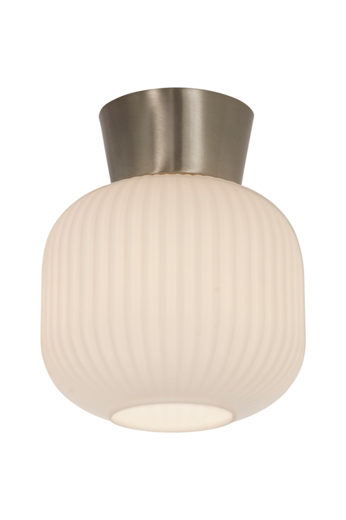 Plafond i metall och opalfärgat glas. Enkel montering i tak med krok. Ljuskälla ingår inte.