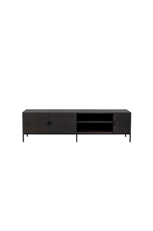 Plain mediabänk är en stilren förvaringsmöbel och erbjuder både dold och öppen förvaring. Modernt underrede i lackerad metall möter ekfaner. Kombinera gärna med andra möbler från samma serie.