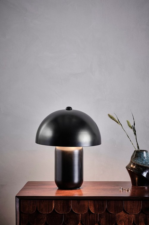 Enfärgad bordslampa i metall med matt yta och som en svamp i formen. Svart sladd, sladdlängd 1,5 m. Material: Metall och textil. Storlek: Höjd 35,5 cm, ø 30 cm. Sockel/lampa: 2 st E14, max 25 w glödlampa eller max 5 w lågenergilampa. Ljuskällor medföljer ej. Tips/råd: Inred med många ljuskällor. 6-8 st rekommenderas i ett normalstort rum.