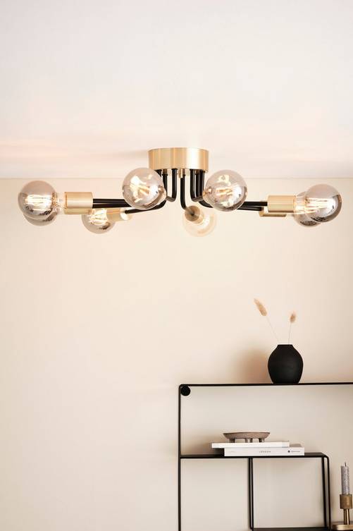 Taklampa i metall med åtta ljuspunkter. En plafond som du enkelt varierar i stil genom att välja ljuskälla efter tycke och smak, gärna med synlig glödtråd. Lampan har krokfäste. Material: Metall. Storlek: Höjd 15 cm, ø 60 cm. Sockel/lampa: 8 st E27, max 25 w glödlampa. Ljuskällor medföljer ej. Takplugg ingår ej p.g.a. nya EU-regler. Den finns att köpa separat och heter THE ROOF EARTH jordad takplugg. Tips/råd: Välj glödlampor med omsorg, de blir en del av lampan och ett sätt att låta lampan byta skepnad är att byta stil på glödlamporna.