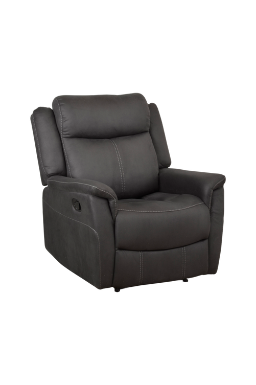 Fåtölj i tyg med reclinerfunktion. Med en manuell spak fäller man bak ryggen och får fram fotstödet så att man kan sitta eller ligga bekvämt i fåtöljen. Bredd 89 cm, djup 93 cm och höjd 105 cm.