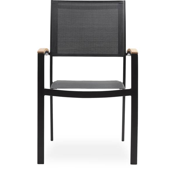 Trädgårdsstol, med armstöd, siddehøjde 44 cm och FSC Mix 70 %, stapelbar. – Sits i svart textelin, stomme i svart pulverlackerad aluminium och armstöd i FSC®-eukalyptus.