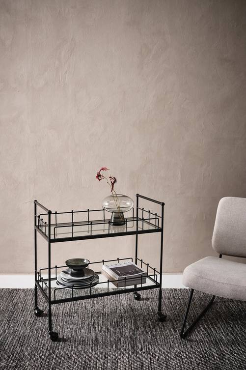 Serveringsvagn på hjul i pläterad metall med hyllplan av glas. Serveringsvagnen förtjänar en renässans i hemmet, en rolig möbel med stor flexibilitet. Du rullar enkelt med dig vagnen och kan ha den som fikabord, avlastningsbord, sidobord, eller barvagn. Den eleganta stilen med glashyllor blir ett glamouröst inslag i din inredning. Viss montering krävs. Material: Metall och glas. Storlek: Höjd 75 cm, bredd 80 cm, djup 40 cm. Mått mellan glasskivorna ca 35 cm. Skötselråd: Torkas av med lätt fuktad trasa och glasputs. Tips/råd: Ställ ett prydnadsföremål på bordet och du har skapat ett vackert stilleben i rummet.