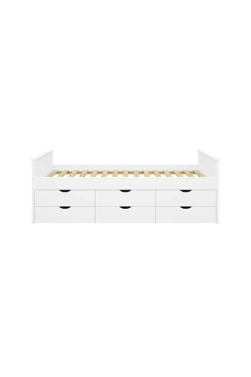 Stuga med 6 funktionella lådor under sängbotten. Tillverkad i lackerad MDF med massiva tallplattor. Madrassstorlek: 90×200 cm (madrass ingår inte). Enkel självmontering.