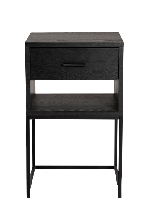 Stilrent sängbord i svart askfaner på MDF och metallstativ, med en låda och softclose funktion. Information Bredd: 40 cm Djup: 40 cm Höjd: 65 cm Delvis monterad.