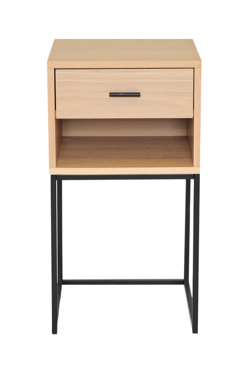 Sängbord med praktisk hylla och låda. Lackad askfaner på MDF och plywood, metallben.
