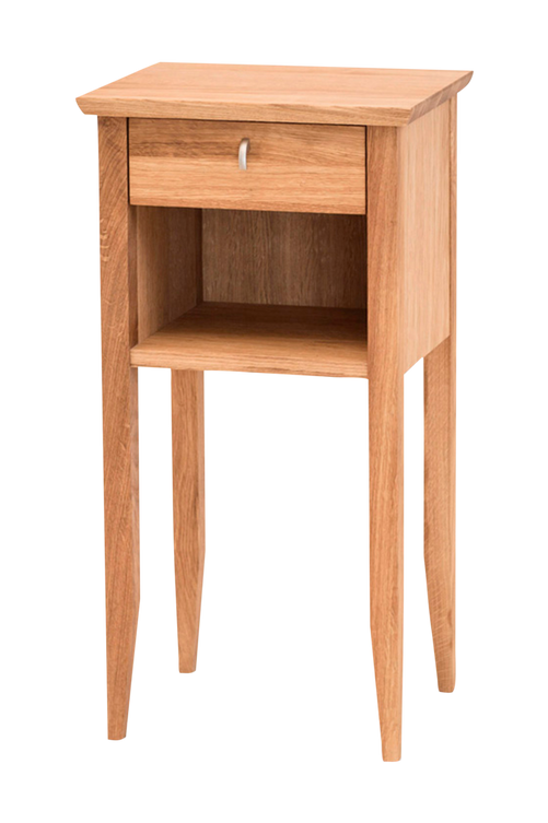 Sängbord med hylla och låda. Bredd 39 cm. Djup 32 cm. Höjd 76 cm. Vikt 9 kg. Monterad