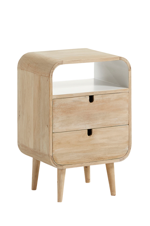 Sängbord med stomme av naturfärgat mangoträ och vitlackerade detaljer. Höjd 60,5 cm Bredd 40 cm Djup 30 cm