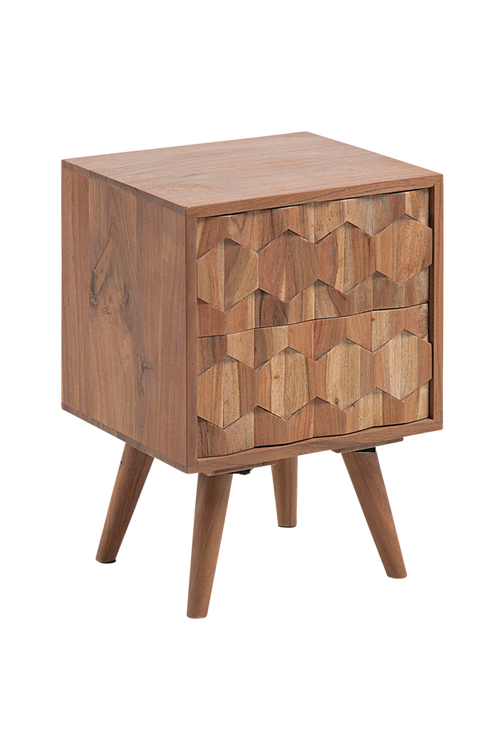 Sängbord av akaciaträ med två lådor på metallglidskenor. Mått: höjd 55 cm, bredd 40 cm, djup 35 cm. Höjd mellan golv och nederkant 20,5 cm. Bredd mellan benparen 34 cm. Montera endast ben.