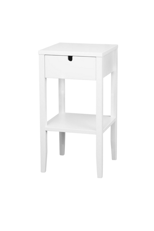 Sängbord med låda och hylla oljad ek. Bredd 36 cm. Djup 36 cm. Höjd 70 cm. Vikt 9 kg.