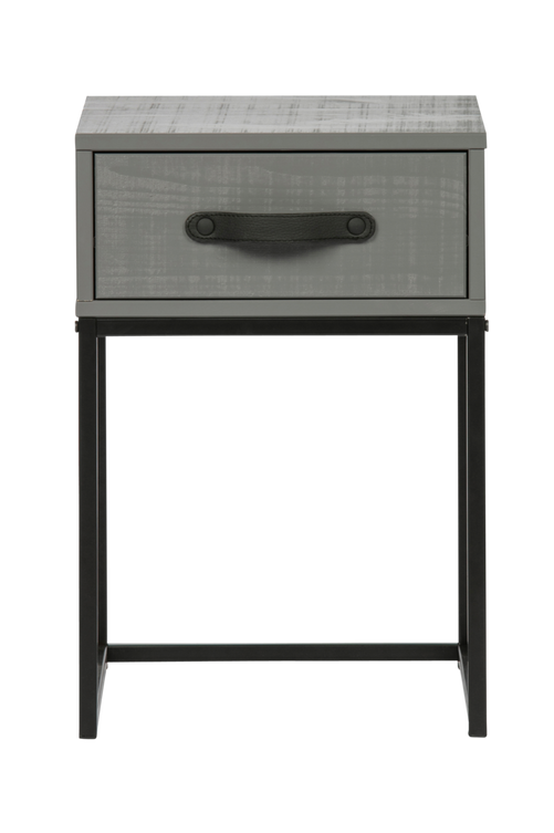 Detta solida, FSC-certifierade sängbord av furu har en rustik yta. Mått: H 52 x B 35 x D 35 cm Lådan (hxbxd) 9x29x28 cm (läderhandtag) Ramen är 35 cm hög och är gjord i metall. Grovsågat trä innebär att träet har sågats över och ger det ett rustikt slipat utseende. Detta ger möblerna en genomlevd vintage look. På grund av denna behandling kan ojämnheter och små sprickor vara extra synliga. Dessa är kännetecken för grovsågat trä. Var och en är därför unik! Detta sängbord levereras som ett kit med en tydlig monteringsanvisning.