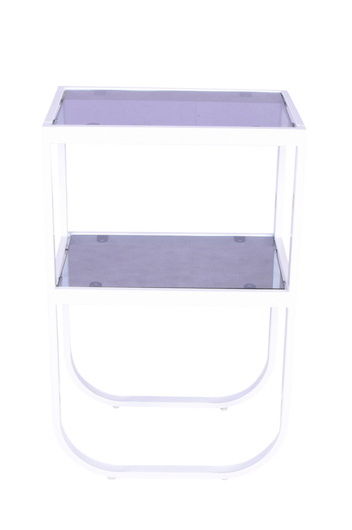 Ett enkelt och snyggt sidobord i två olika nivåer, bordsskivorna är i sotat glas och underrede i metall. Ett perfekt bord att ha bredvid sängen! Bredd: 30 cm Höjd: 70 cm Längd: 45 cm Kräver enklare montering.