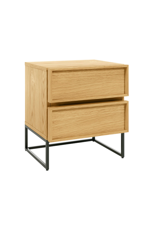 Sängbord från kollektionen Taiana, med ekfaner och lådor med ram av massiv ek, nu med stålram som ger en naturlig, industriell stil. Det är också enklare att städa under.