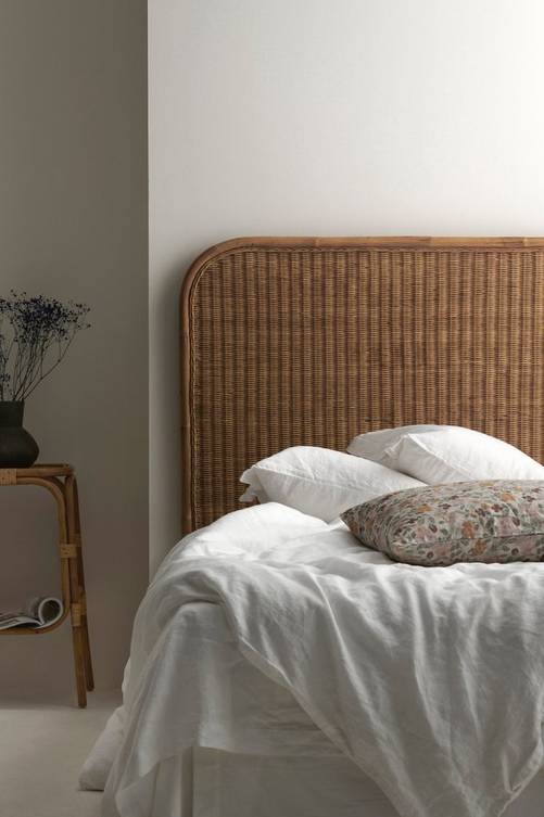 Huvudgavel i rotting med tätflätad topp och dekorflätad kant. Gaveln ställs på golvet. Bredd 160 cm, höjd 137 cm, djup 4 cm. Benhöjd 24 cm.