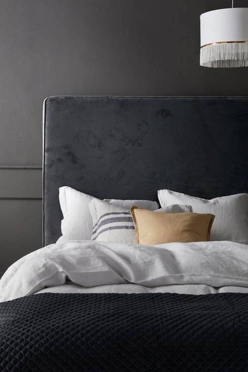 Stoppad sänggavel med stomme av trä och klädsel i sammet. Sänggaveln står på golvet och fästs i väggen. Fyllning av polyeter. För 180 cm-säng . Mått: 185 x 140 cm. Djup 10 cm. Vill du titta närmare på ett tyg och känna på kvaliteten? Mejla oss på customerservice@ellos.se eller ring 033-33000 och beställ hem ett gratis tygprov! Ange det artikelnummer du ser längst ner i denna beskrivning.