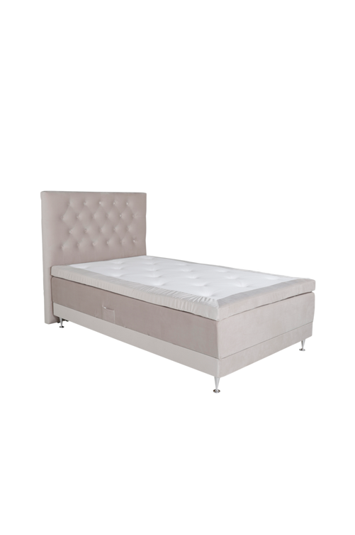 Våxtorp, en Modern Ställbar Kontinentalsäng i enklare tappning. I ett sammetstyg. En säng som kommer ge ett maffigt och lyxigt intryck till sovrummet med sin höga höjd uppbyggd i 2 lager för att ge en god sömn. Sängramen är uppbyggd med en massiv träram i gran för en stabil grund. Resårmadrassen är uppbyggd av pocketfjädrar med 5 komfortzoner som följer kroppens former samt stålkonstruktion med motor från Linak. Sängen är steglöst inställningsbar, i sitt- och liggställning, som styrs med hjälp av fjärrkontroll och erbjuder en god komfort. Den pikerade bäddmadrassen är uppbyggd av mickrofibervadd och kallskum. 10 år på ram och fjäder brott Sammantaget är sängen uppbyggd för att ge en skön sovkomfort samt ge ett enhetligt intryck i sin helklädda design. Hela sängen vilar på champangeben i silvrig aluminium. Kombineras med Falkenberg, fristående lyxig sänggavel i helklädd design i ett sammetstyg med dekorsömmar och djuphäftade klädda knappar. Med denna sänggavel är det enkelt att skapa en lyxig känsla till ditt sovrum. Ett tips är att ställa gaveln mellan väggen och sängen så krävs ingen förankring. Material resårmadrass: ram i granträ, plywood och pocketresår, Höjd resårmadrass: 19cm, Material bäddmadrass: syntetiskt fiber och polyether, Höjd bäddmadrass: 9cm, Totalhöjd säng: 58cm. Lättare montering krävs.