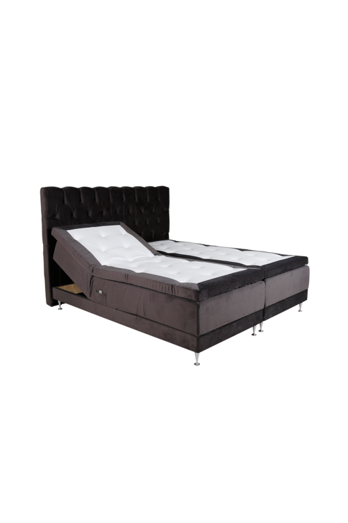 Våxtorp, en Modern Ställbar Kontinentalsäng i enklare tappning. I ett sammetstyg. En säng som kommer ge ett maffigt och lyxigt intryck till sovrummet med sin höga höjd uppbyggd i 2 lager för att ge en god sömn. Sängramen är uppbyggd med en massiv träram i gran för en stabil grund. Resårmadrassen är uppbyggd av pocketfjädrar med 5 komfortzoner som följer kroppens former samt stålkonstruktion med motor från Linak. Sängen är steglöst inställningsbar, i sitt- och liggställning, som styrs med hjälp av fjärrkontroll och erbjuder en god komfort. Den pikerade bäddmadrassen h är uppbyggd av mickrofibervadd och kallskum. 10 år på ram och fjäder brott Sammantaget är sängen uppbyggd för att ge en skön sovkomfort samt ge ett enhetligt intryck i sin helklädda design. Hela sängen vilar på champangeben i silvrig aluminium. Kombineras med Skogaby, en Fristående lyxig sänggavel i helklädd design i ett sammetstyg med dekorsömmar och djuphäftade klädda knappar. Med denna sänggavel är det enkelt att skapa en lyxig känsla till ditt sovrum. Ett tips är att ställa gaveln mellan väggen och sängen så krävs ingen förankring. Material resårmadrass: ram i granträ, plywood och pocketresår, Höjd resårmadrass: 19cm, Material bäddmadrass: syntetiskt fiber och polyether, Höjd bäddmadrass: 9cm, Totalhöjd säng: 58cm. Lättare montering krävs.