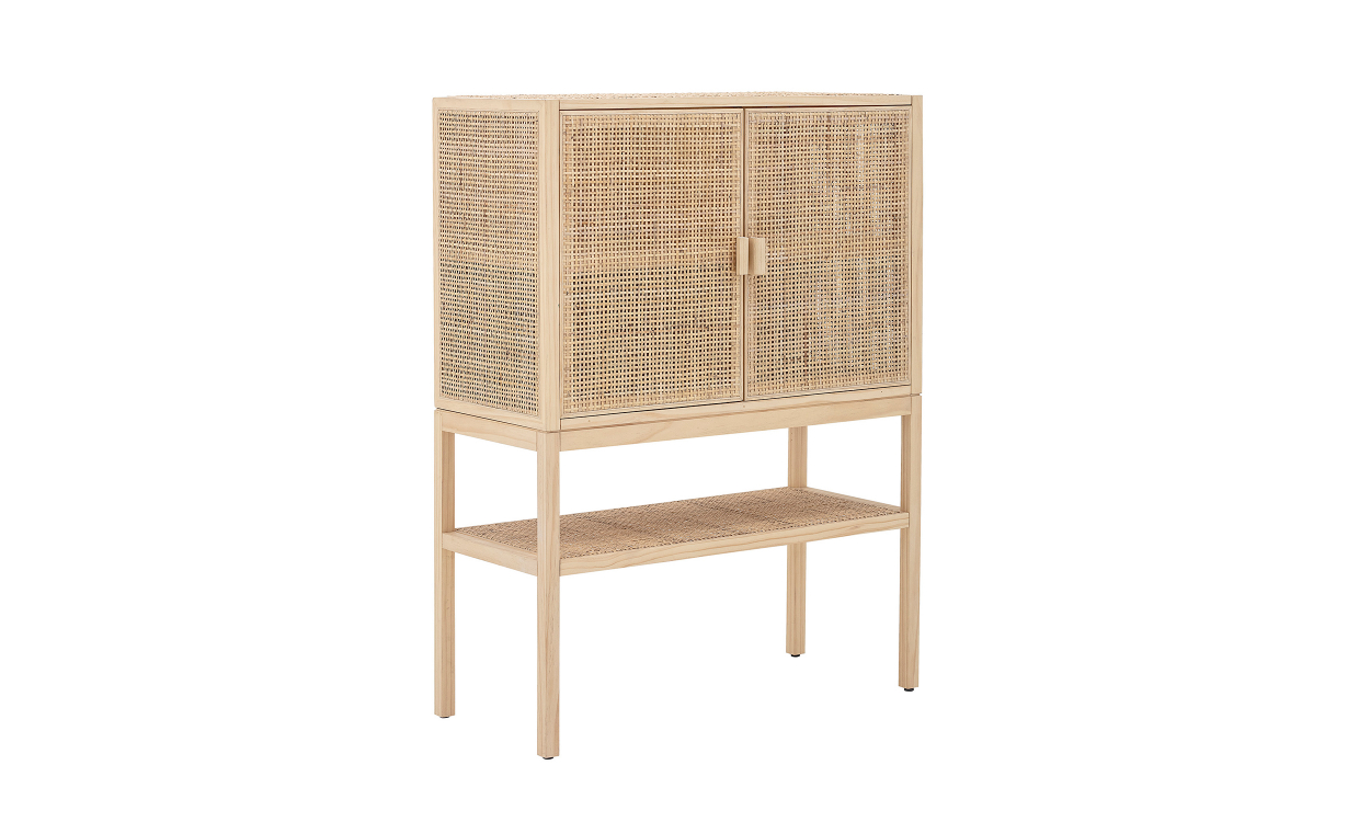 Sanna är en möbel som både är funktionell och otroligt vacker. Skåpet dekoreras av en fin mesh av rotting, medan resterande skåp är av tall. Inuti skåpet finns två praktiska hyllplan samt ytterligare ett mellan benen.Design & komfortDekorativt skåp med tre hyllor.Tillverkad i tall och rotting.Rengör med en fuktig trasa.Distans mellan hyllor: 27 cm.Storlek hyllutrymmen: 27x38x41 cm.Maxvikt per hylla: 15/20 kg.Anti-tipp fästen inkluderas.Leverans & förpackningLevereras omonterad.Antal förpackningar: 1 st