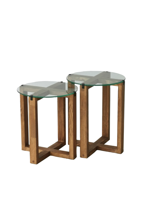 100% HÄRDAT GLAS Stomme: 100% SPÅNSKIVA MED MELAMINBELÄGGNING Tjocklek: 1,8 cm Diameter: 40 cm Höjd: 45 cm (1 st.) Diameter: 40 cm Höjd: 50 cm (1 st.)