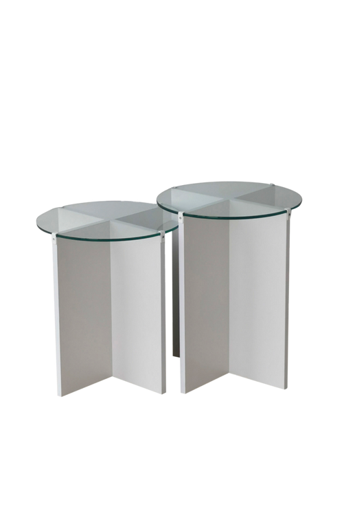 100% HÄRDAT GLAS Stomme: 100% SPÅNSKIVA MED MELAMINBELÄGGNING Tjocklek: 1,8 cm Diameter: 40 cm Höjd: 50 cm (1 st.) Diameter: 40 cm Höjd: 60 cm (1 st.)