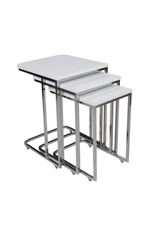 Stomme: 100% metall bordsskiva: 100% MDF storlek 1: 41×46 cm höjd: 48,8 cm (1 st.) storlek 2: 36×44 cm höjd: 53,8 cm (1 st.) storlek 3: 31×42 cm höjd: 59 cm (1 st.)