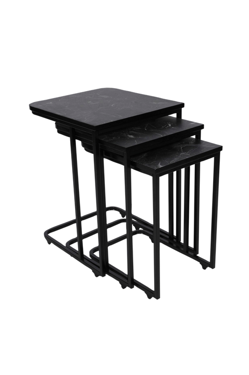 Stomme: 100% metall bordsskiva: 100% MDF storlek 1: 41×46 cm höjd: 48,8 cm (1 st.) storlek 2: 36×44 cm höjd: 53,8 cm (1 st.) storlek 3: 31×42 cm höjd: 59 cm (1 st.)
