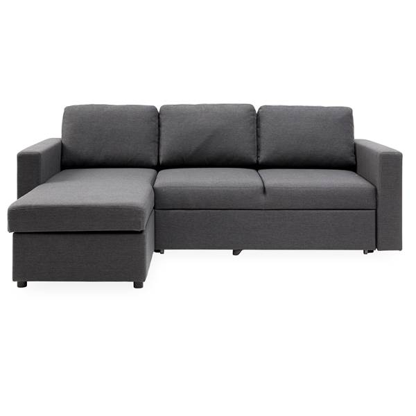 Bäddsoffa, polyeterskum, kan spegelvändas, med förvaring och siddehøjde 42 cm. – Inari 94 Antracit tyg, ben i svart plast och sits: polyeterskum rygg: skumgranulat
