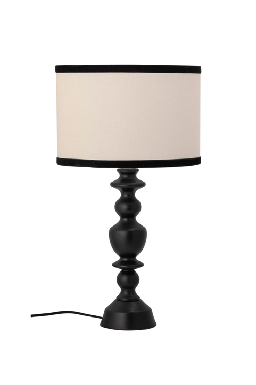 Light up your room with this retro looking lamp. The black edge around the lamp shade is made of soft printed black flock. The base is laquered dark rubberwoord and the mix of black and the natural but edgy linen color on the lampshade makes this lamp stand out in the room.