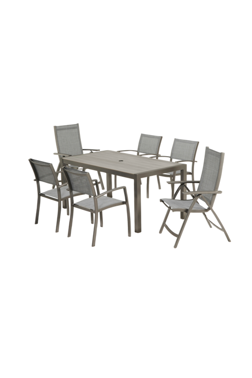 Bekvämt och lättskött set med 4 stapelbara karmstolar och rektangulärt bord 163×88 cm med bordsskiva av duraboard (rep- och fläcktålig) och rostfria stommar av aluminium. 100% underhållsfri. För 4-6 personer.