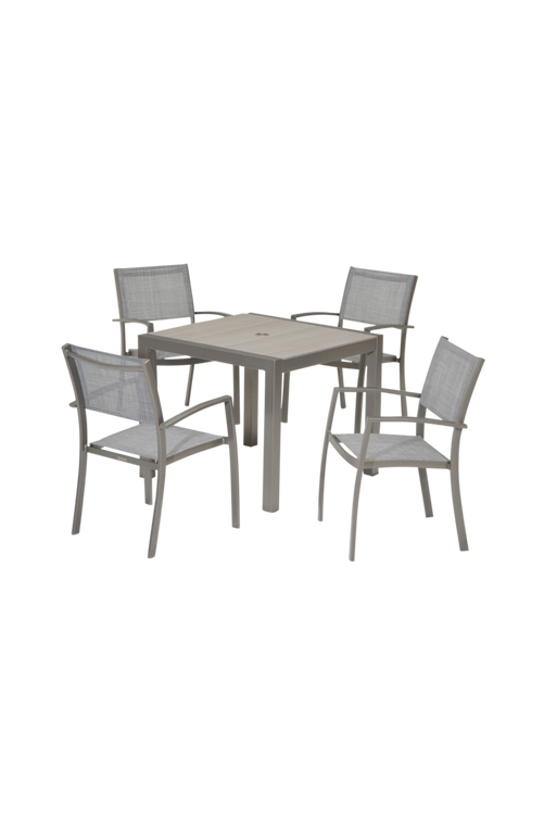 Bekvämt och lättskött set med 4 stapelbara karmstolar och kvadratiskt bord 88×88 cm med bordsskiva av duraboard (rep- och fläcktålig) och rostfria stommar av aluminium. 100% underhållsfri. För 4 personer.