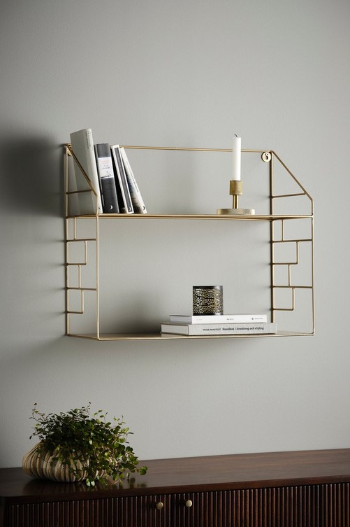 Vägghylla av pulverlackad metall. Hål för upphängning. Maxbelastning 15 kg. Material: Metall. Storlek: Höjd 51 cm, bredd 61 cm, djup 24 cm. Skötselråd: Torkas av med lätt fuktad trasa. Tips/råd: Placera flera SHELBY på rad och få en dekorativ hyllvägg.