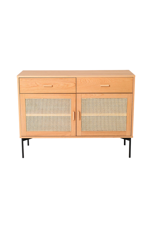 Sideboard i lackad ek, rotting och metall med 2 dörrar och 2 lådor. 1 justerbar hylla i vardera skåp(2) Bredd: 120 cm, Djup: 40 och Höjd: 90 cm. Levereras omonterad.