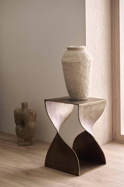Sidobord av aluminium med strukturerad kopparfinish. Eftersom färgen är framställd av metallens naturliga färg kan färgnyans och finish variera jämfört med bilden. Varje bord har därmed ett unikt utseende. Levereras monterat.