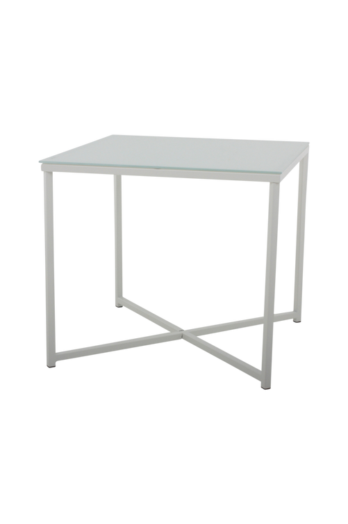 Sidobord i härdat glas och ben i lackerad metall. Bredd 75 cm, djup 75 cm och höjd 75 cm. Montera själv.