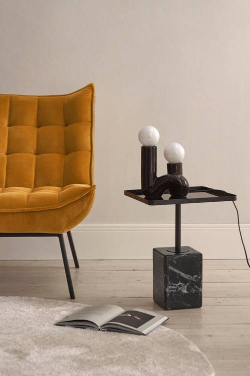 Sidobord med marmorfot. Bordsskiva i svart spegelglas på pulverlackad metallstomme. Enklare montering.