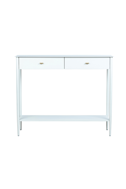 Modernt sidobord i metall med 2 lådor utrustad med mässingsknopp som en snygg detalj.