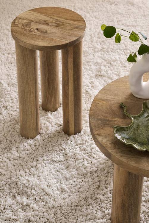 Sidobord i mangoträ med kraftiga, runda ben. Behandlat med matt lack. Höjd 59,5 cm, diameter på toppskivan 34,5 cm.