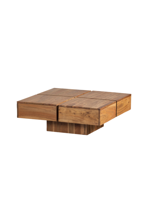 Sidobord i lekfull design med retrokänsla Tillverkat av behandlat akaciaträ Bordsskiva i unik design H 30 cm x B 80 cm x D 80 cm Lyra soffbord ingår i en exklusiv kollektion från det nederländska inredningsmärket WOOOD och är det perfekta tillskottet i eleganta inredningsstilar. Lyra är stilfull och passar i en botanisk, lantlig eller retroinspirerad inredning. Bordsskivan är formad av fyra blockformade sektioner och det robusta blockbenet ger en snygg stil. Material Akaciaträ kännetecknas av den varma, röda nyansen. Denna färg avtar något vid användning och exponering för ljus. De tydliga ådringarna och flammiga märkena ger detta tåliga träslag mycket karaktär. Olika färgnyanser, oregelbundenheter och sprickor ger djup och karaktär till denna naturprodukt. Mått Höjd: 30 cm Bredd: 80 cm Djup: 80 cm 4x bordsskiva HxBxD: 15x40x40 cm (är ihålig) Benets höjd: 28,5/15 cm Benets tjocklek: 40×40 cm (är ihålig) Stommens tjocklek: 1,5 cm Maximal belastning: 15 kg Vikt: 23 kg Skötsel Du håller enkelt föremål av akaciaträ rena med en ren, torr trasa. För mer noggrann rengöring kan akaciaträet torkas av med en lätt fuktad trasa och ljummet vatten. Ytterligare behandling med en speciell möbelolja är möjlig, och detta förstärker den vattenavvisande effekten från de naturliga oljorna som finns i denna typ av trä. Leverans Sidobordet levereras monterat, i ett paket. För att skydda hårda golv, sätt möbeltassar av filt på undersidan av benet.